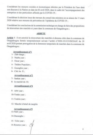 La mairie de Ouagadougou a décidé de la réouverture de 27 marchés et yaars qui avaient été fermés pour éviter la propagation du coronavirus au Burkina Faso.